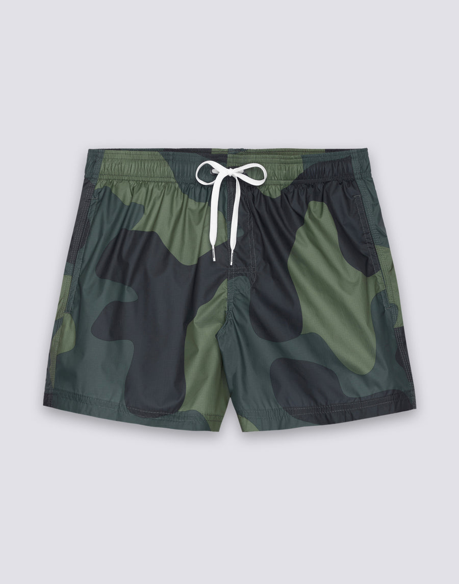 Men's camouflage print elasticated waistband swim shorts. Made from creased-look ripstop fabric, they're ultra-lightweight and quick-drying. They feature the iconic Sundek rainbow in a contrasting color on the back and a back pocket with an embroidered logo patch. Outer leg length: 14"/35 cm (size M).