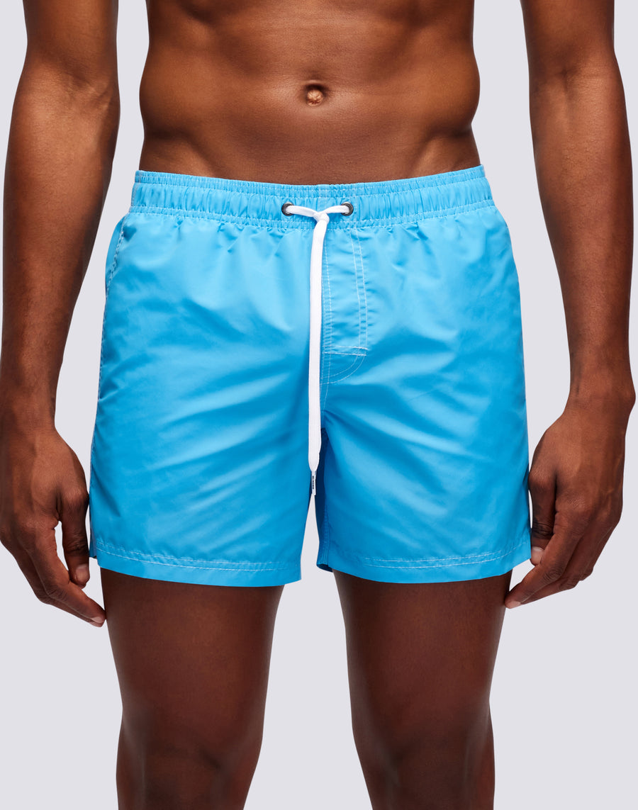 Swim trunks with elasticated drawstring waistband, made of iconic taffeta quick-dry fabric. Triple stitching on stress areas for maximum strength. Iconic rainbow detail on the back to form the Italian flag. Outseam length 14"/35 cm (size m).