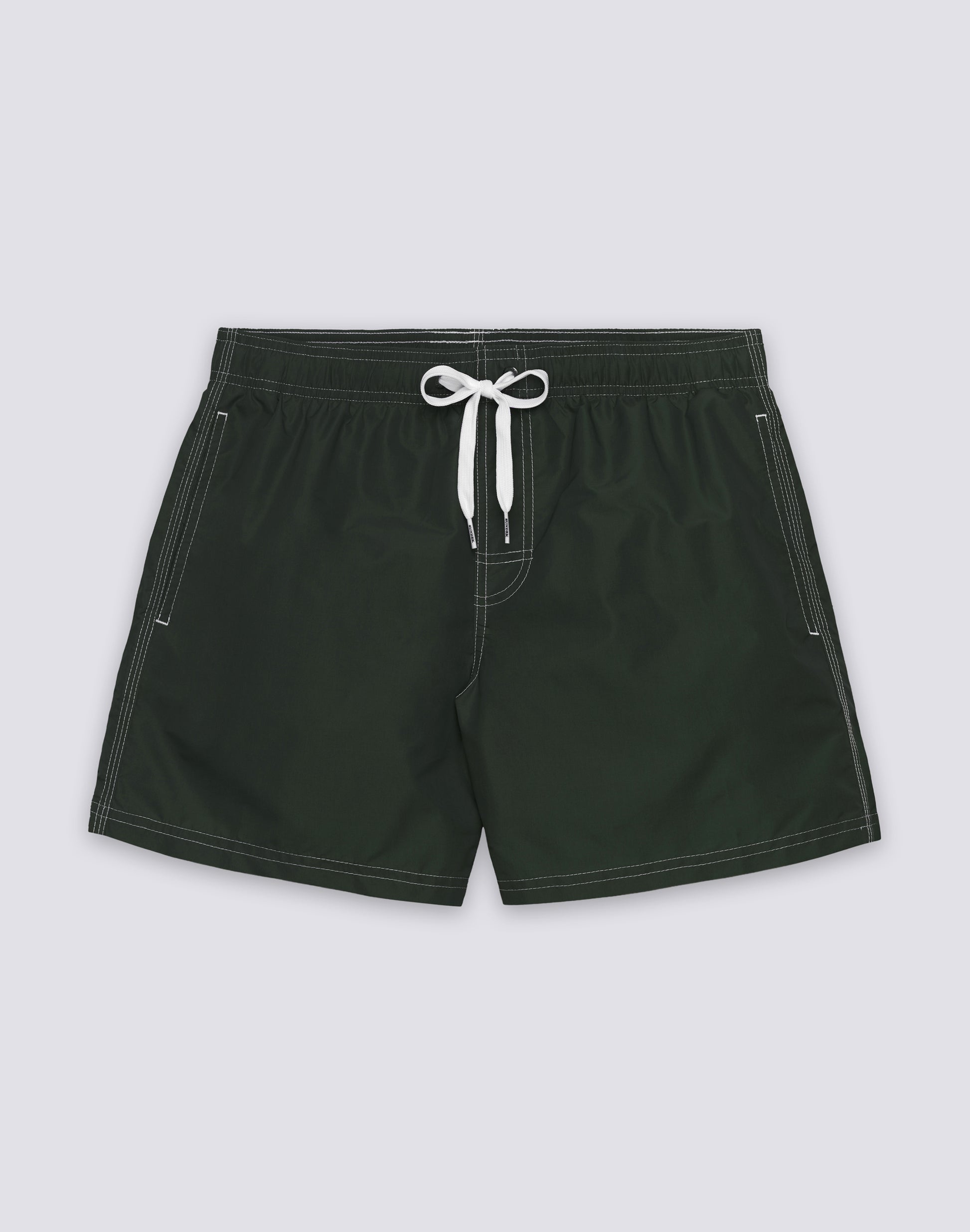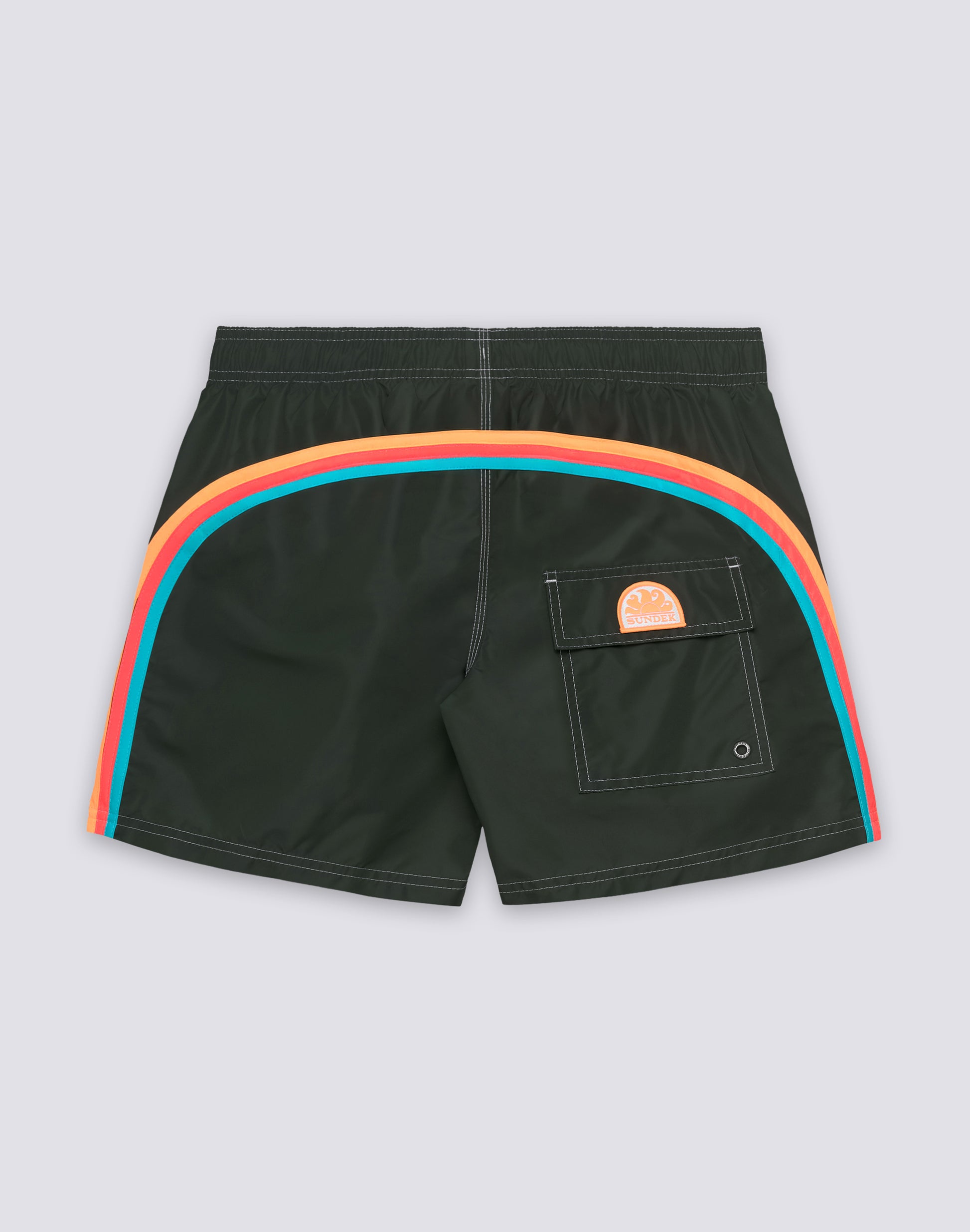 Short men's swim shorts with elasticated waist, drawstring and iconic Sundek rainbow on the back. This swimsuit is made with three-needle stitching and 100% of our historic fabric, nylon-taffeta: smooth as silk, light and resistant to everything, it dries very quickly to give you comfort everywhere, in the waves and outside waterfall. Length 35 cm (size M), measured on the outside of the leg.