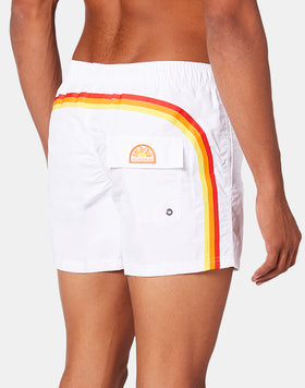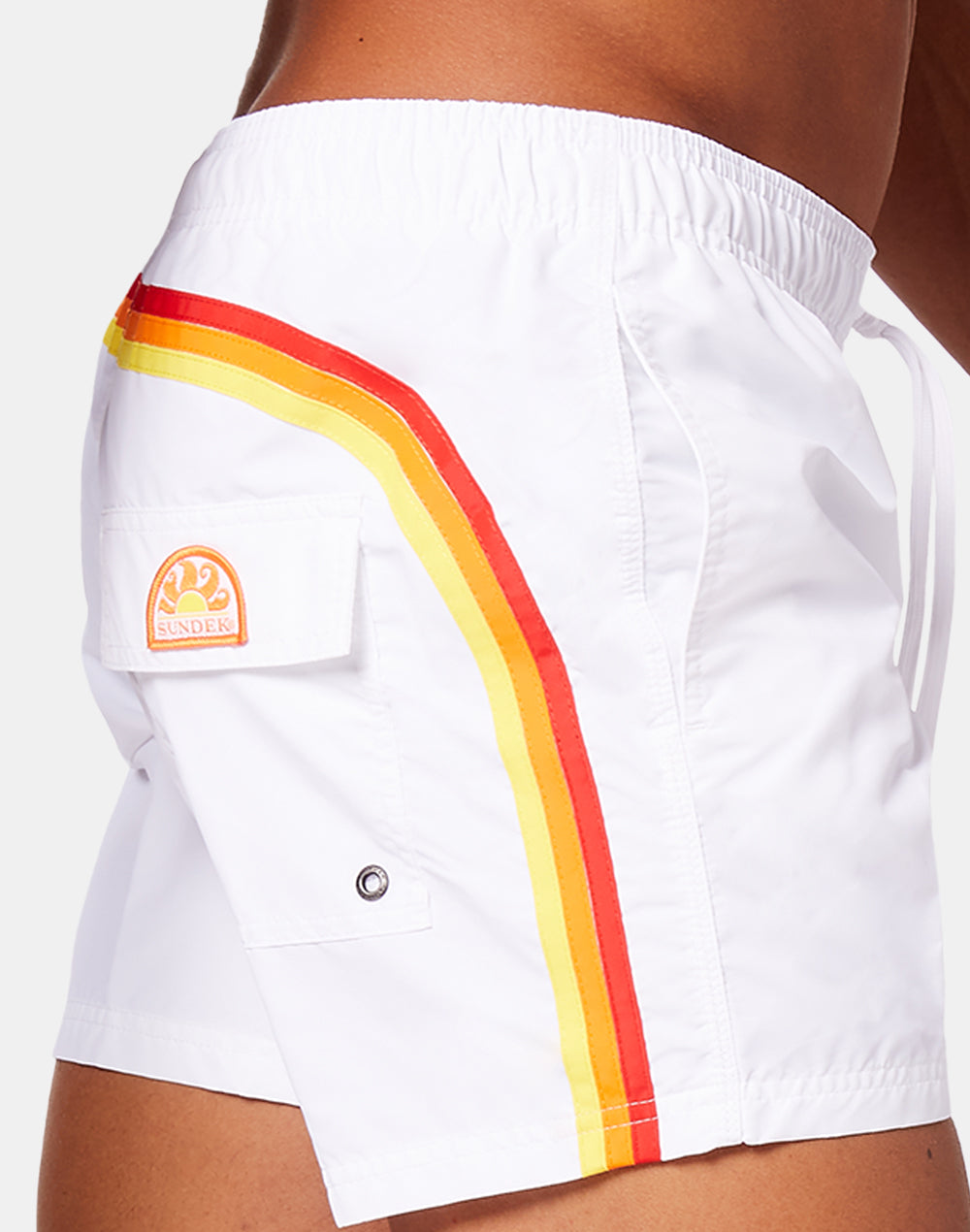 Short men's swim shorts with an elasticized waist, drawstring and iconic Sundek rainbow on the back. This swimsuit is made with three-needle stitching and 100 percent with our historic fabric, nylon-taffeta: silky smooth, lightweight and resistant to everything, it dries super fast to give you comfort anywhere, in the waves and out of the water.