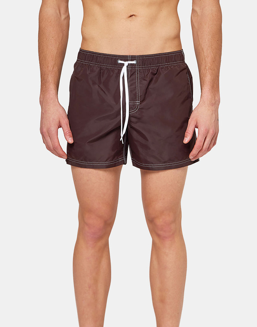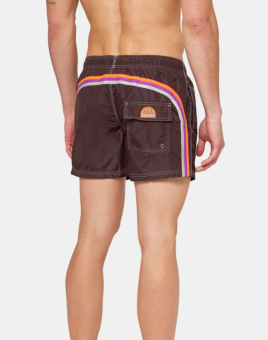 Short men's swim shorts with an elasticized waist, drawstring and iconic Sundek rainbow on the back. This swimsuit is made with three-needle stitching and 100 percent with our historic fabric, nylon-taffeta: silky smooth, lightweight and resistant to everything, it dries super fast to give you comfort anywhere, in the waves and out of the water.