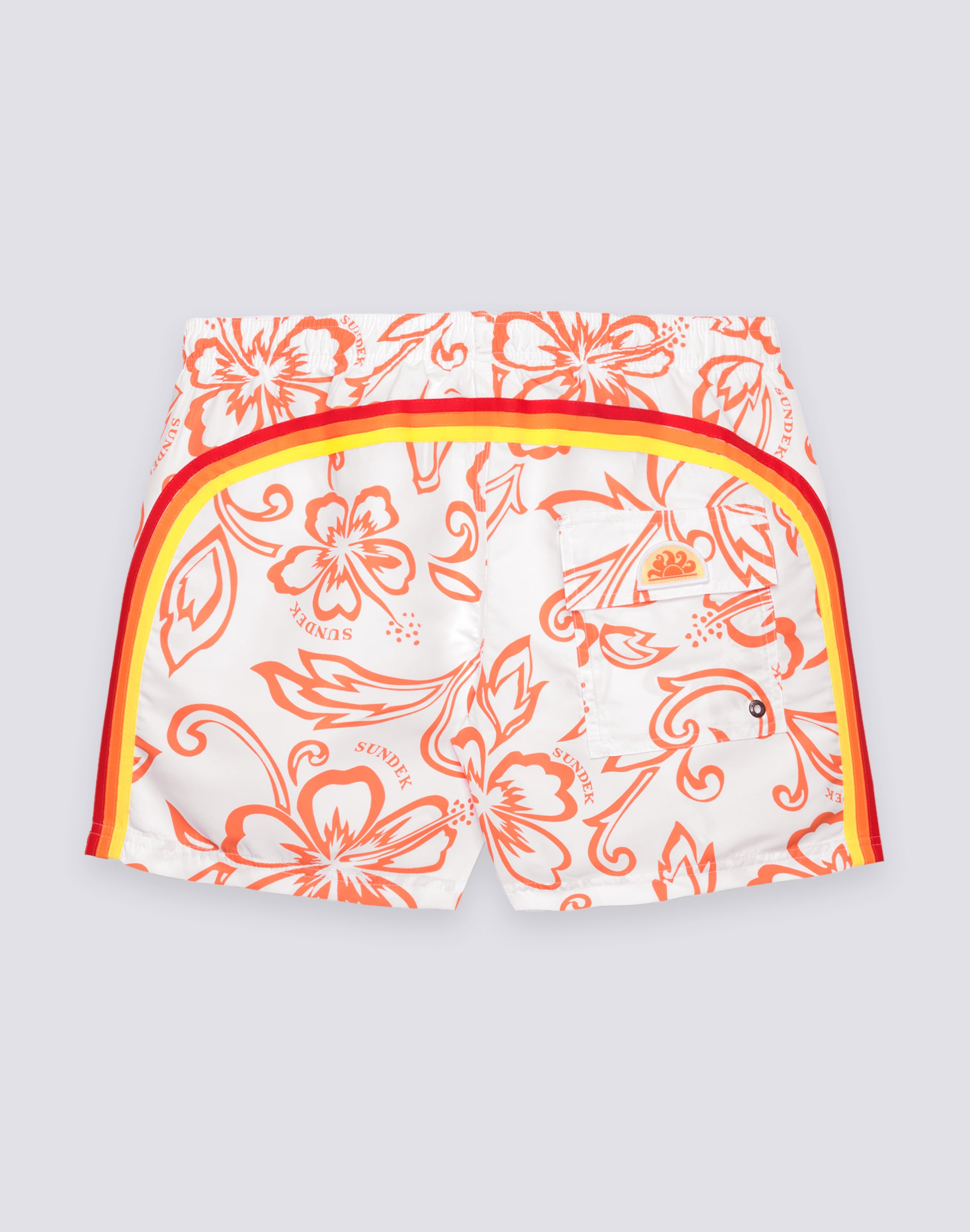 The Archive Hibiscus print shorts celebrate Sundek heritage with an archive floral print that recalls historic styles from the past. These men's vintage boardshorts with an elastic waist feature the iconic Hibiscus print and an archive rainbow of colors, for a retro-contemporary look that blends nostalgia and style. The print is a tribute to the historic Sundek styles that have shaped beachwear history. This vintage floral pattern features stylized hibiscus flowers. A design that recounts decades of Sundek history and celebrates the tropical aesthetic of the golden years of surfing. The rainbow detail on the back also references archive colors, with a vintage palette that differs from the classic rainbow. This distinctive element completes the heritage look and certifies the authenticity of a style that celebrates the past while looking to the future.