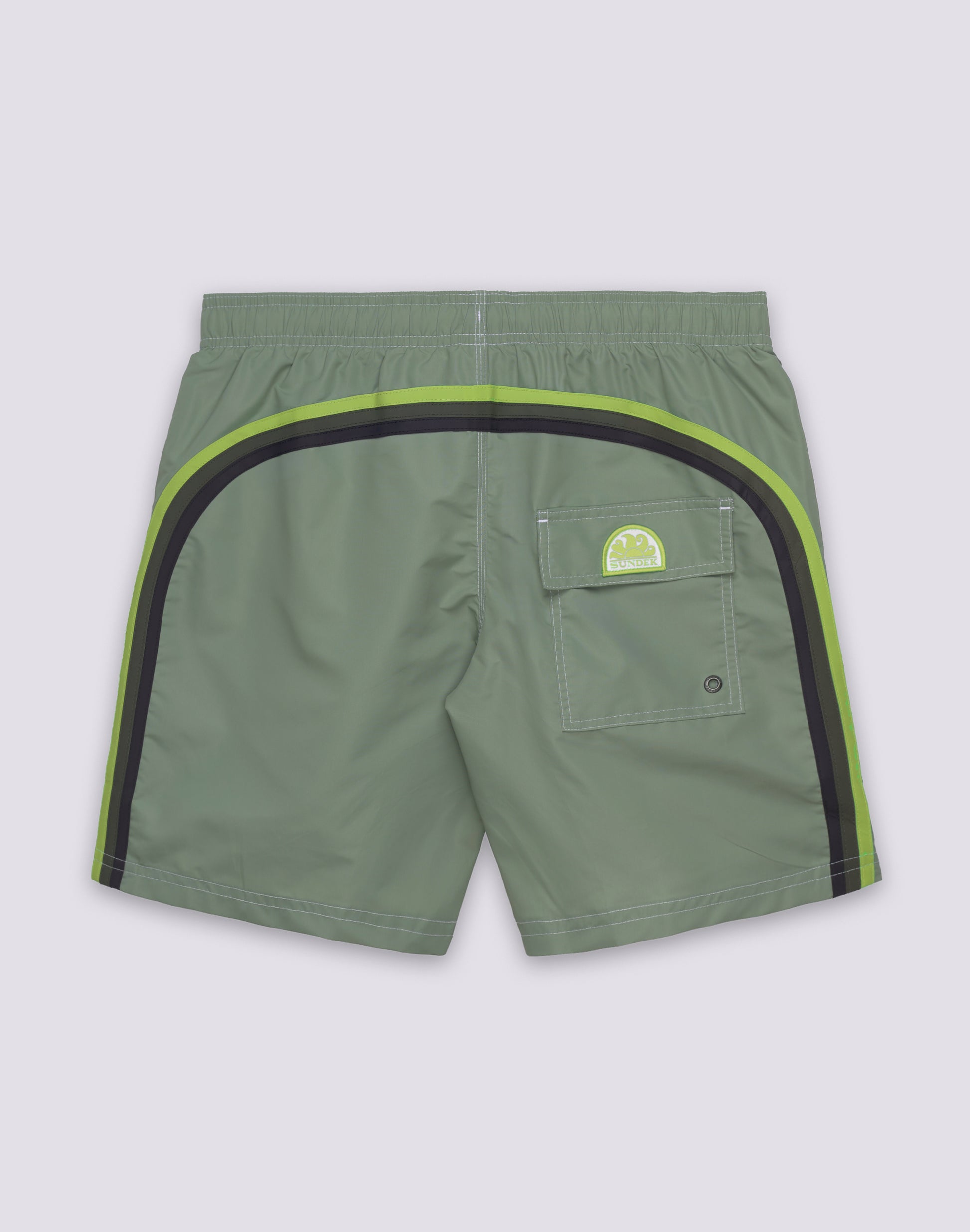 Featuring the unmistakable Sundek rainbow in contrast on the back, a symbol of the brand's authenticity and heritage, these swim shorts feature an elastic waistband with an adjustable drawstring for a personalized fit. Triple-needle reinforced seams ensure maximum strength and durability, even in the most demanding conditions. Perfect for swimming, surfing, sailing, and leisure, this men's mid-length swimsuit combines technical performance with casual style. The classic fit makes it suitable for all ages and body types, while Sundek quality ensures comfort in and out of the water.