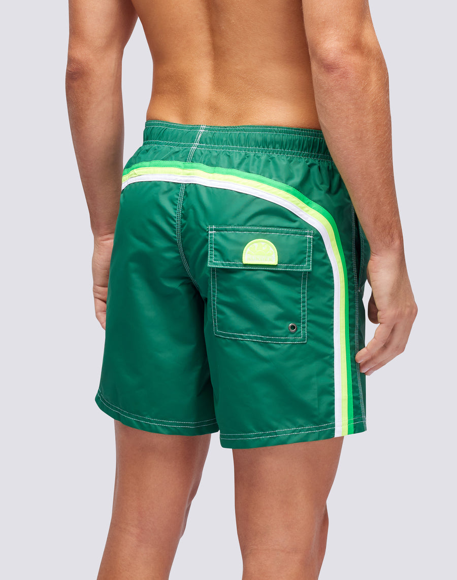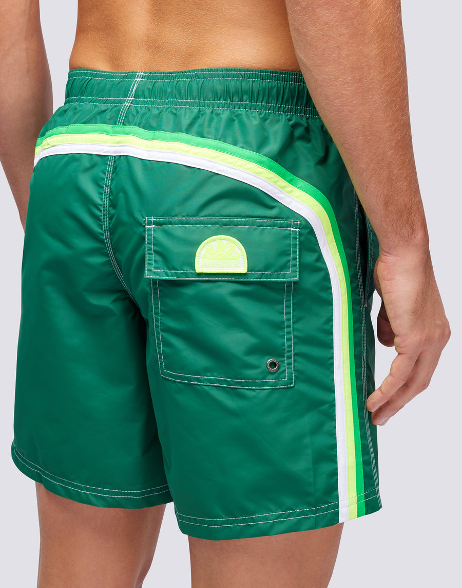 All the timeless Sundek style in this mid-length boardshort with an elasticated waist. Stylish, comfortable, designed to last holiday after holiday: it's our classic boardshort with drawstring waist and contrasting rainbow on the back, made from our historic lightweight and quick-drying nylon taffeta fabric, durable, with three-needle stitching for a further reinforcement. Length 41 cm (size M), measured on the outside of the leg.