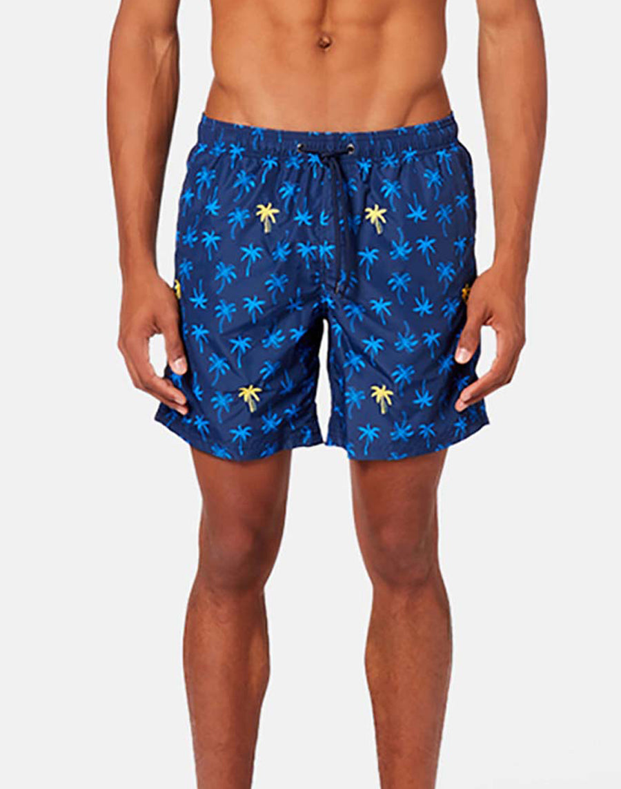 Ready to ride the next wave with this mid-length men's swim trunks with an elasticated waist and mini palm print with embroidery. Made of light recycled polyester, it guarantees adherence and comfort thanks to the presence of the drawstring and the elastic waistband. Length 16”/41 cm (in size M).