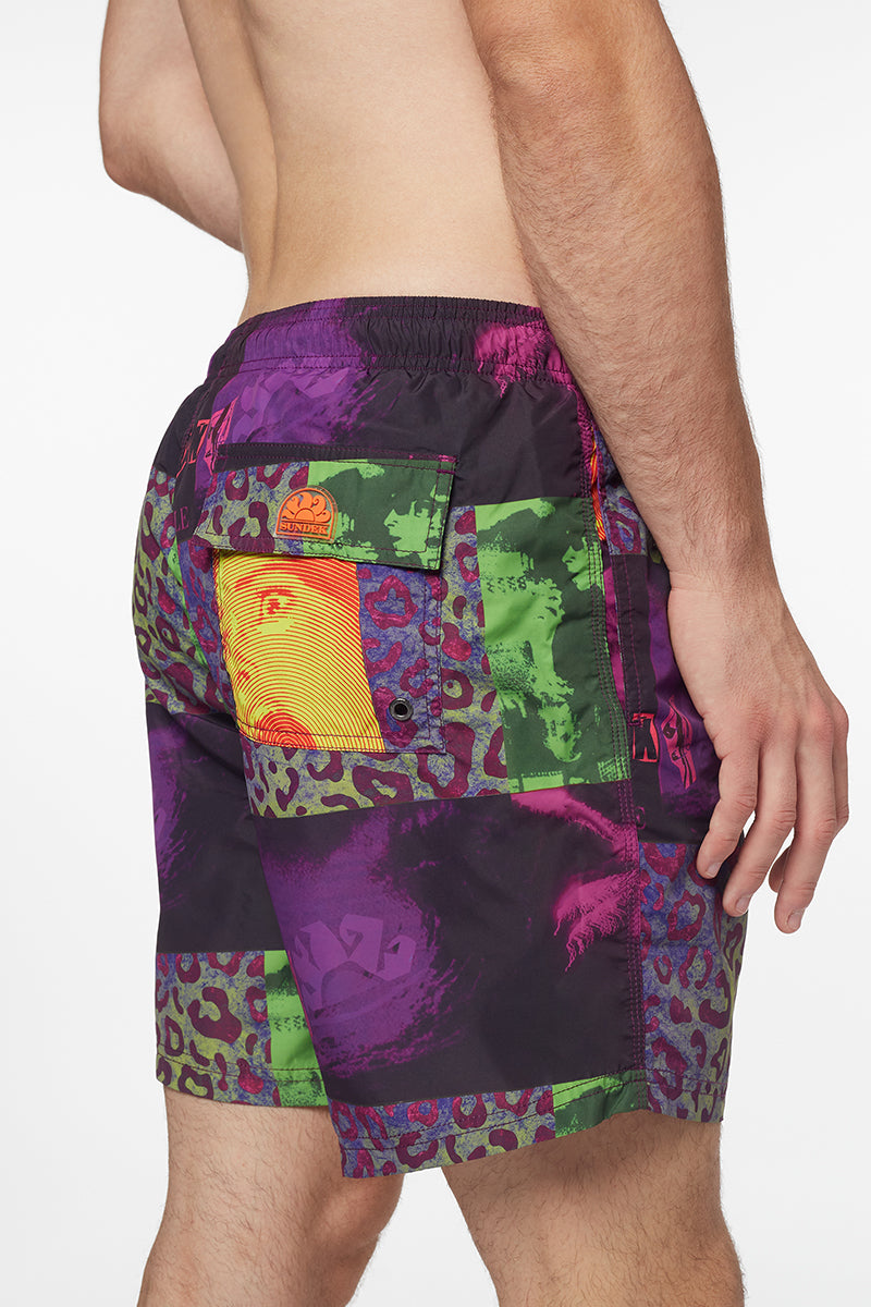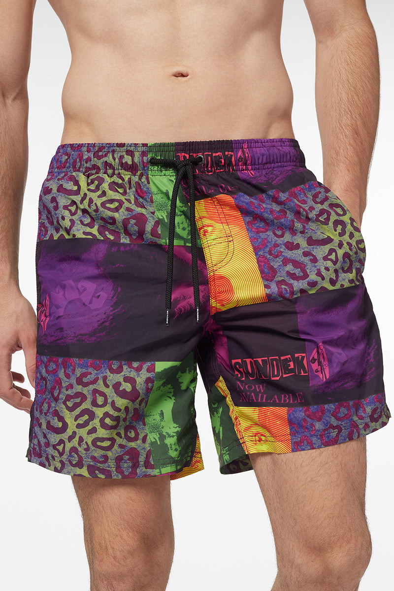 Get ready to ride the next wave in this Zine print mid-rise elasticated waist men's swim trunks. Made of light recycled polyester, it guarantees adherence and comfort thanks to the presence of the drawstring and the elastic waistband. Length 16”/41 cm (in size M).