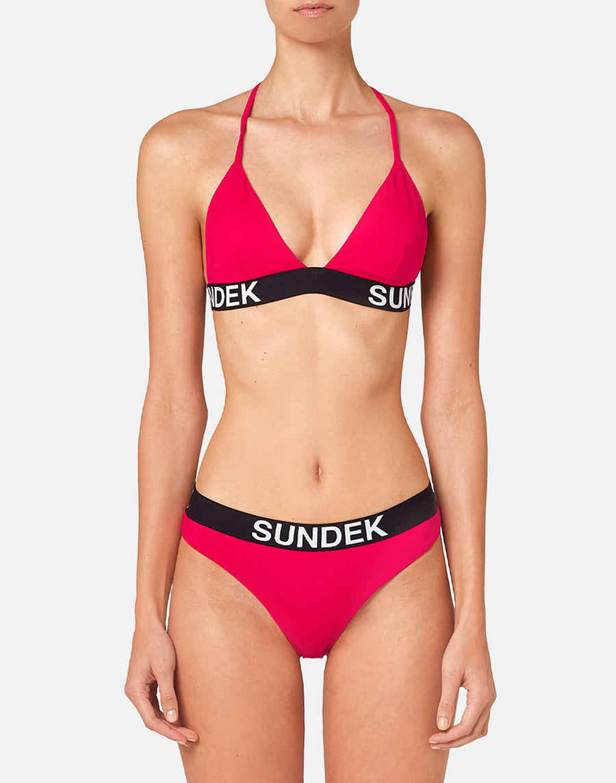 Adjustable triangle top that combines femininity and sporty appeal for a dynamic beachwear look highlighted by contrasting logo elastic. Also perfect at all times thanks to the VITA by Carvico fabric that accommodates all movements and is not afraid of contact with chlorine, creams and sun oils.