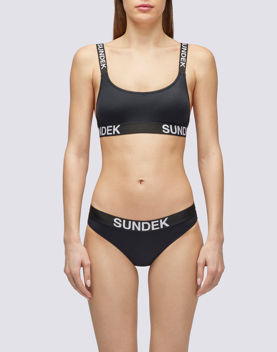 Made from eco-friendly and comfortable fabric, this non-padded balconette top is finished with a jacquard elastic underbust band with contrasting Sundek logos. The perfect choice to make a splash in sporty chic style.