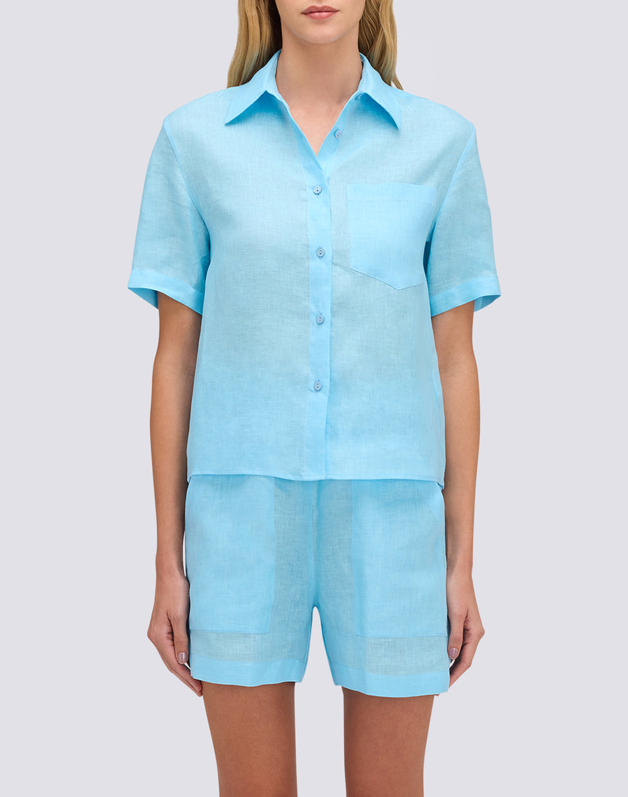 Regular fit women's short-sleeved linen shirt with front pocket. A basic, cool and lightweight garment, ideal for pairing with skirts or trousers for minimalist yet stylish outfits. Wear it open, perhaps over your bikini at the beach.
