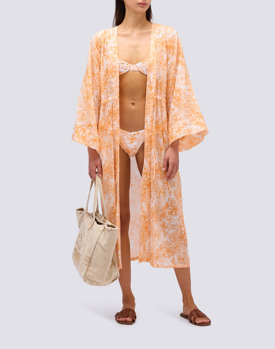 Long kimono dress with Fleur de Joie print, central front opening and sewn-on strap. Wear paired over bikini sets in the same pattern for elegant cocktail looks.