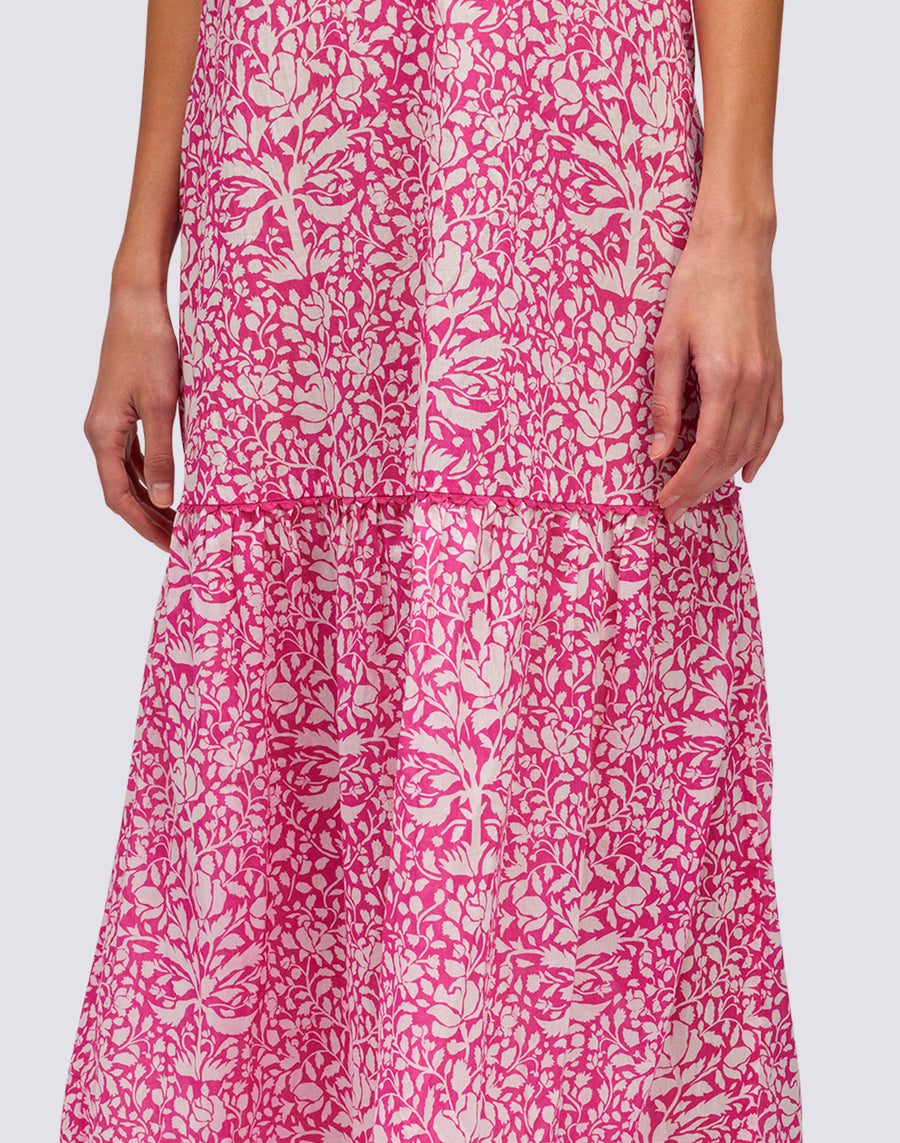 Elegant long women's dress with adjustable straps and piping detail. The floral print adds a romantic touch. Perfect for a refined and sophisticated look.