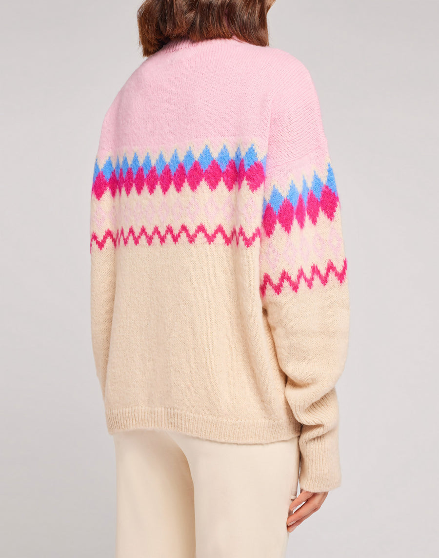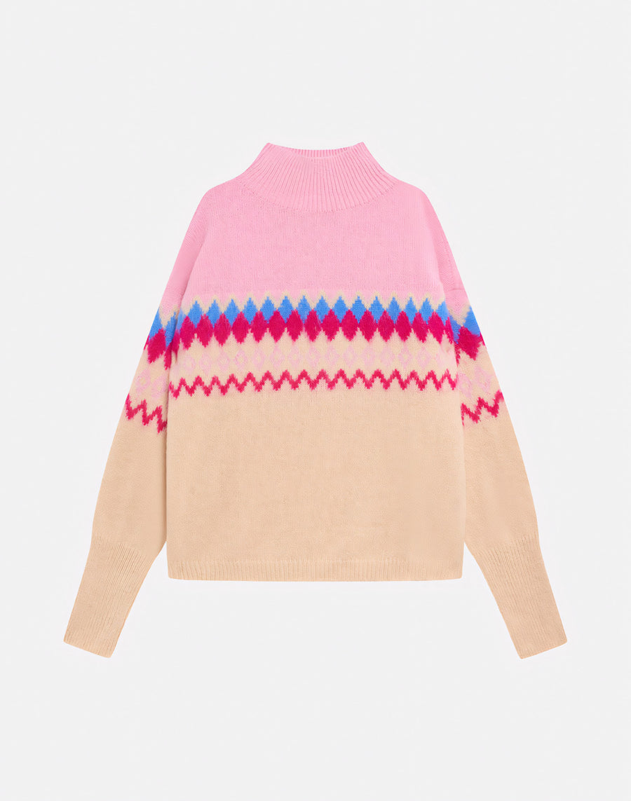 Norwegian-style maxi sweater in jacquard gauzed mohair, soft-handed, regular fit; fits a variety of looks to compose ever-changing outfits.