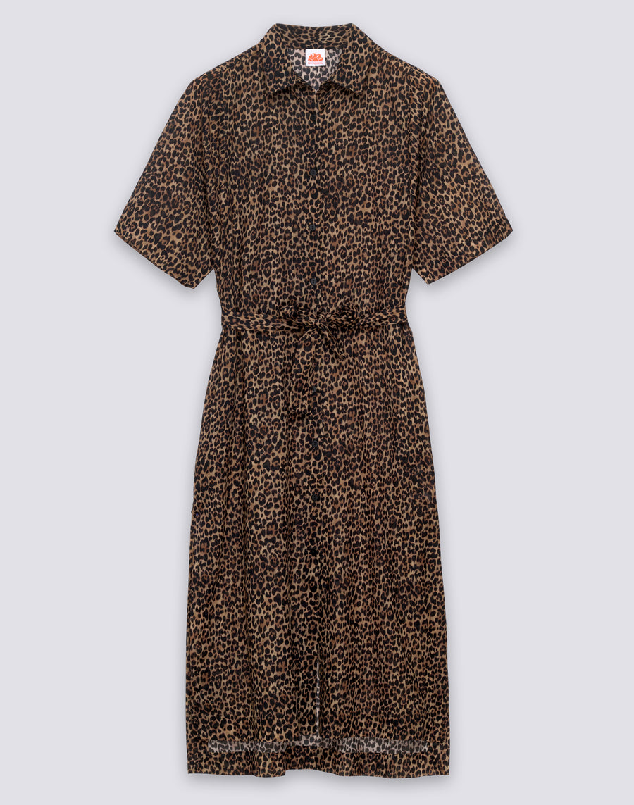 This long women's shirt dress with animal print and removable waist belt combines style and versatility: elegant shirt cut, half sleeves, wild pattern, belt to define the silhouette. For those looking for a refined casual daytime look with distinctive character.